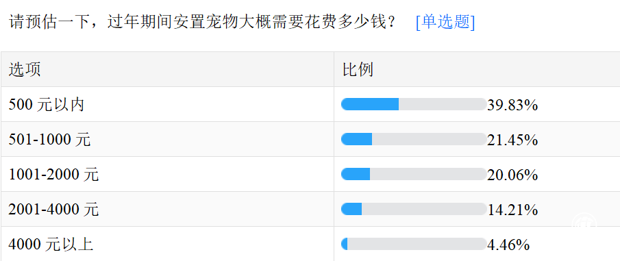 從安置寵物所需開銷上來看,調(diào)研數(shù)據(jù)顯示,有近4成的“鏟屎官”春節(jié)期間安置寵物的預(yù)估費(fèi)用在500元以內(nèi),另有超過40%的人估計(jì)的開銷在500-2000元之間,還有14%左右的年輕人春節(jié)期間安置寵物預(yù)計(jì)需要花費(fèi)2000-4000元。