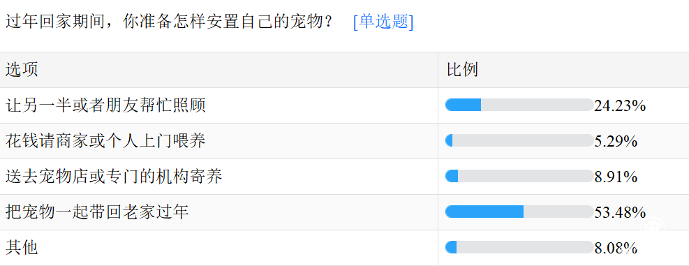 對(duì)于那些需要回老家過年的人來說,春節(jié)期間寵物如何安置成為了他們歸鄉(xiāng)前需要做好的準(zhǔn)備工作。調(diào)研結(jié)果顯示,53.48%的90后養(yǎng)寵青年會(huì)不計(jì)成本地把寵物一起帶回老家過年,遠(yuǎn)高于其他方式。24.23%的年輕人會(huì)讓另一半或者朋友幫忙照顧,僅8%的人會(huì)送去寵物店或?qū)iT機(jī)構(gòu)寄養(yǎng),或許是寵物們的身心健康讓年輕人對(duì)于“寄養(yǎng)”望而卻步。