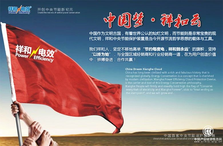 “中國夢,祥和云”,把祥和人致力于為實現(xiàn)中華民族的偉大復興的中國夢追求,力爭用祥和中央節(jié)能保護裝置這一祥和首創(chuàng)的中央節(jié)能保護設備,占領中國節(jié)能節(jié)電市場的1/6,致力于節(jié)能這一繼電能、石油、煤炭、天然氣之后的第五大資源開發(fā),為國家再造一個綠色三峽電站,為中國碳中和偉大事業(yè)貢獻祥和力量。