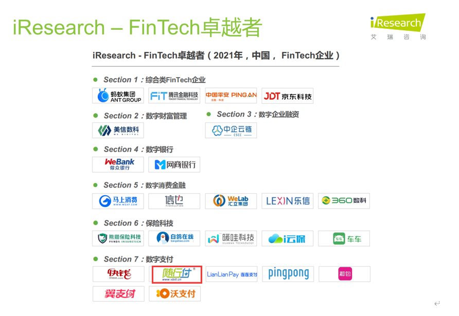 據(jù)悉,《2021年中國(guó)fintech TOP50企業(yè)》榜單聚焦于“科技創(chuàng)新能力、技術(shù)輸出能力”的考察,旨在為金融行業(yè)的科技創(chuàng)新實(shí)踐,以及金融機(jī)構(gòu)的合作伙伴選擇提供實(shí)證參考。為了保證榜單的專(zhuān)業(yè)性、權(quán)威性、公正性,榜單由艾瑞咨詢(xún)聯(lián)合來(lái)自銀行、保險(xiǎn)、證券機(jī)構(gòu)以及科技 學(xué)術(shù)單位的數(shù)十位FinTech專(zhuān)家共同提名、評(píng)選,并確定最終入圍者。入圍者分為“FinTech技術(shù)服務(wù)商(25家)、 FinTech企業(yè)(25家)”兩大類(lèi), 共計(jì)50家企業(yè)。隨行付憑借在數(shù)字支付的技術(shù)優(yōu)勢(shì)和創(chuàng)新實(shí)踐,榮譽(yù)入選該榜單。該榜單在業(yè)界具有廣泛的影響,這是對(duì)隨行付金融科技創(chuàng)新的又一次肯定。