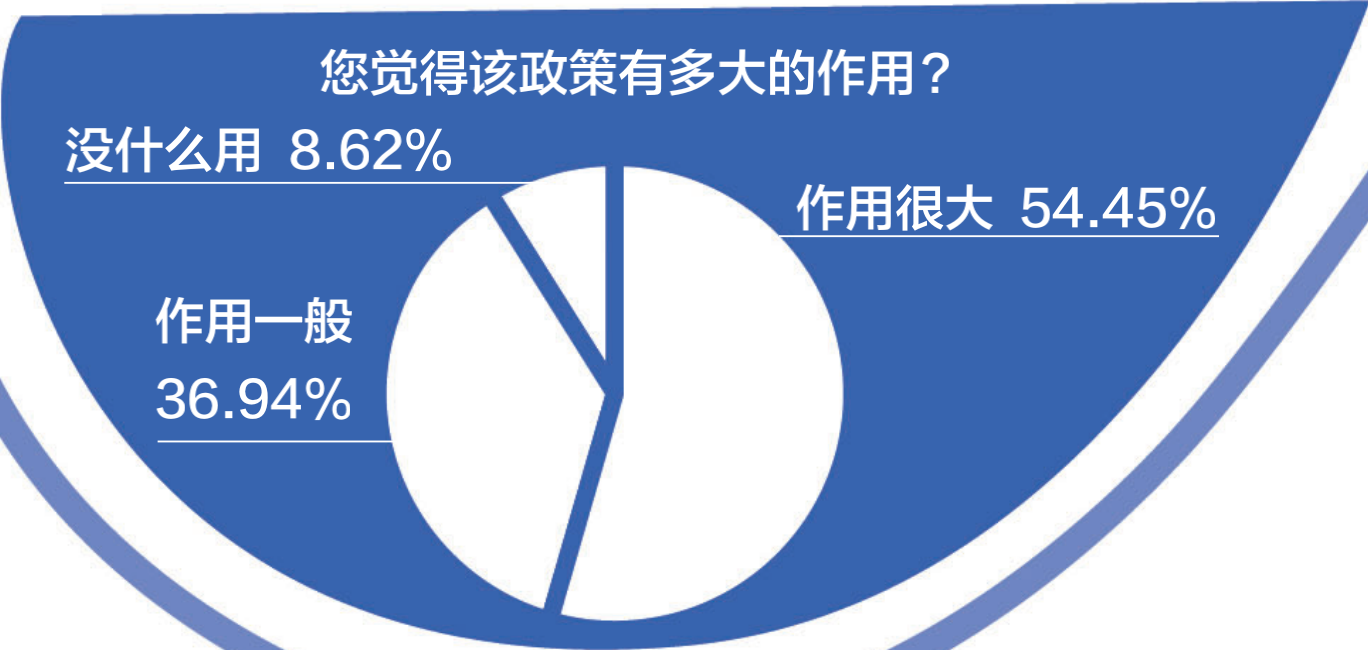 談及對政策的評價,54.45%的受訪家長認為作用很大,36.94%的受訪家長認為作用一般,僅8.62%的受訪家長認為沒什么作用。