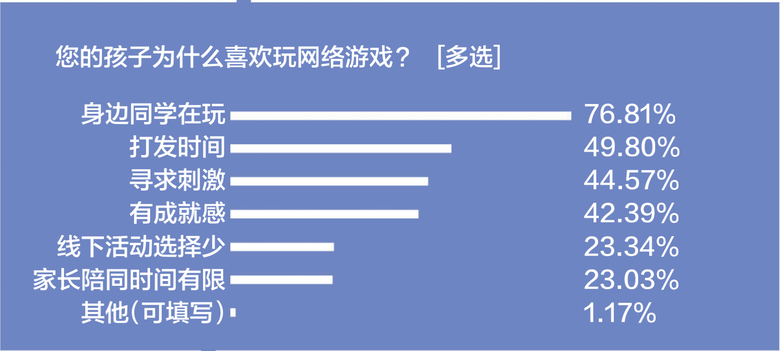 那么,未成年人為什么玩游戲?結(jié)果顯示,“身邊同學在玩”這一從眾心理是影響中小學生玩網(wǎng)絡游戲的首位重要原因,76.81%的受訪家長以及43.03%受訪學生均認同該觀點,占比最高;其次是“打發(fā)時間”“尋求刺激”以及“有成就感”。