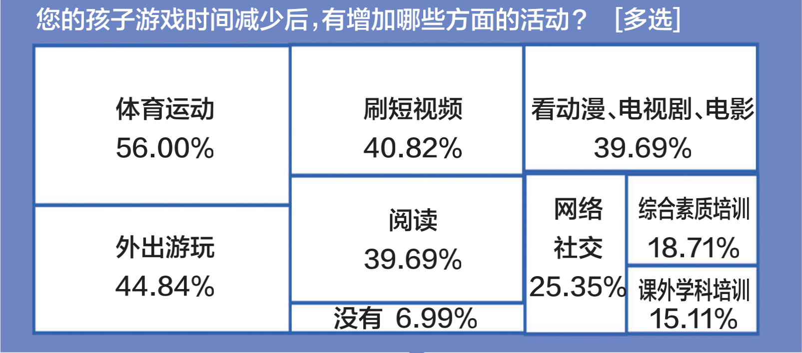 孩子游戲時間減少后,有增加哪些方面的活動?調(diào)查發(fā)現(xiàn),62.21%的學生增加了體育運動時間,占比居首;緊接著則是閱讀和外出游玩,所占比例分別為49.69%和40.33%。家長方面,過半數(shù)受訪家長反映孩子參加體育運動的機會增多,占比最高,其次是外出游玩,占44.84%;還有40.82%表示孩子刷短視頻的時間也有所增加。
