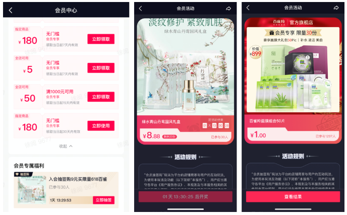 核心權(quán)益:會(huì)員抽簽8.8元購古風(fēng)禮盒/1元購50片面膜