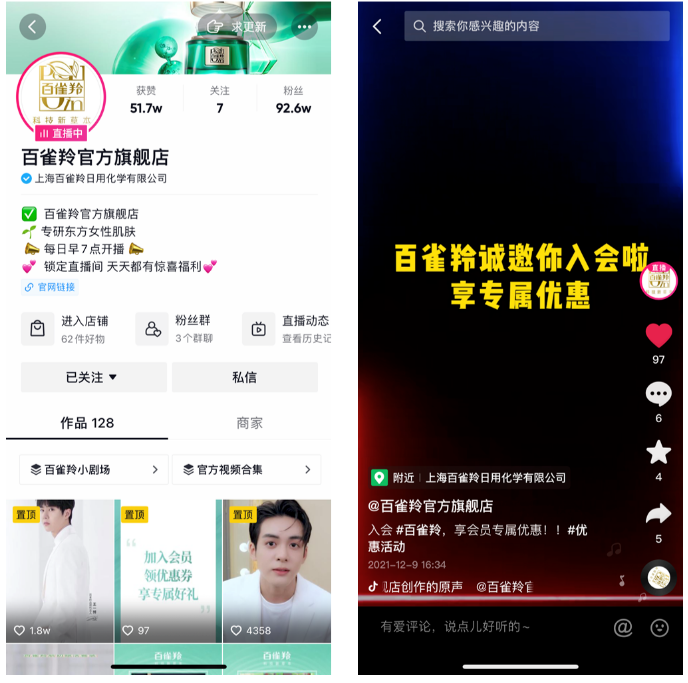 2021年3月,國潮代表百雀羚啟動(dòng)抖音電商品牌旗艦店直播,將百雀羚護(hù)膚之道分享給用戶。運(yùn)營模式為服務(wù)商合作非自營,快速度過冷啟動(dòng)期并且在雙十一當(dāng)日突破500wGMV。