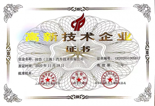 自2020年以來,沛岱連續(xù)兩年獲得ISO 9001:2015質量管理體系認證證書;2021年,沛岱汽車獲得由上海市科學技術委員會、上海市財政局、國家稅務總局上海市稅務局聯(lián)合頒發(fā)的高新技術企業(yè)證書。