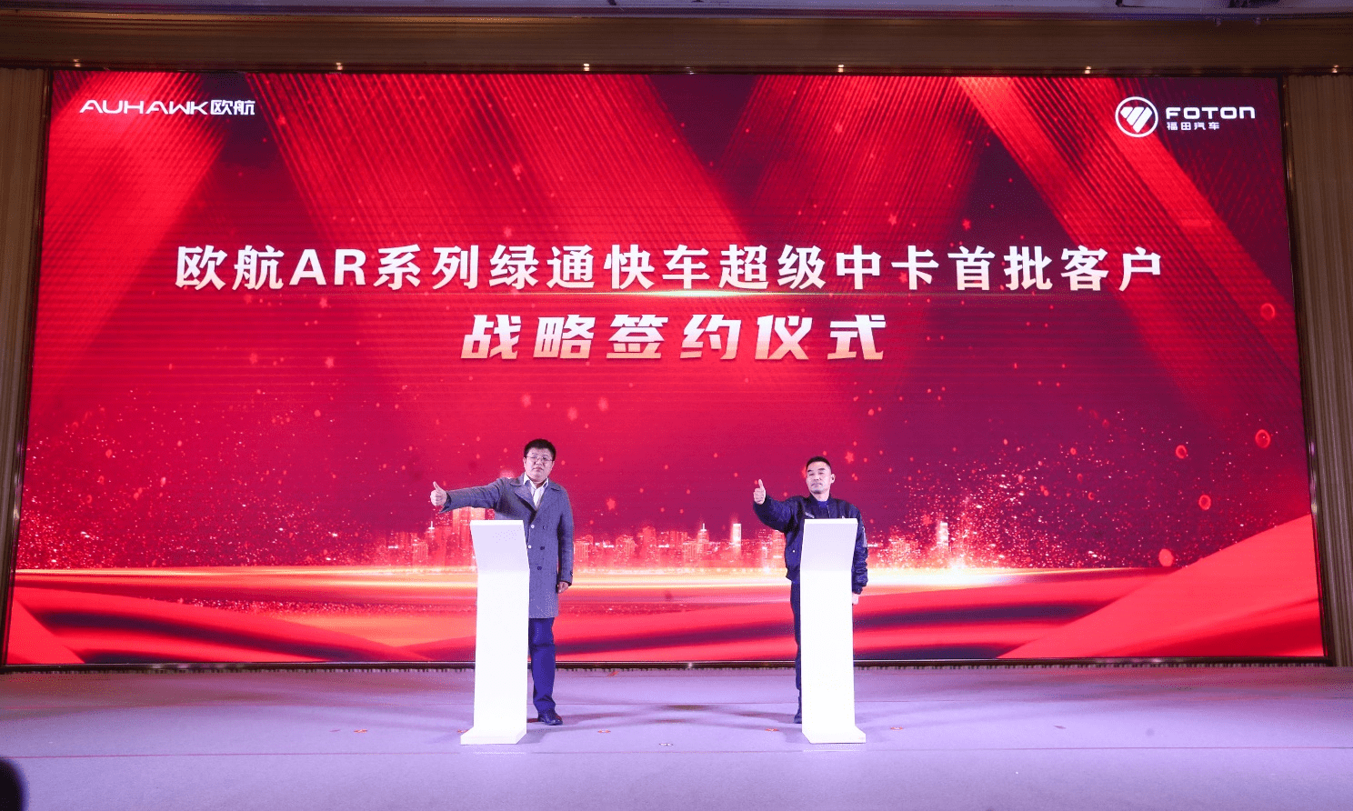 【歐航歐馬可事業(yè)部黨委書(shū)記總裁唐宏超、阜陽(yáng)萬(wàn)駿銷售公司總經(jīng)理劉飛鳴、玉柴股份總工程師林鐵堅(jiān)、法士特銷售總公司副總經(jīng)理兼東南營(yíng)銷公司總經(jīng)理?xiàng)顤|、歐航歐馬可事業(yè)部營(yíng)銷公司歐航銷售公司經(jīng)理劉寶先、安徽鑫龍業(yè)汽車銷售有限公司董事長(zhǎng)周偉共同發(fā)布?xì)W航AR系列綠通快車】