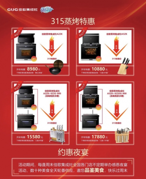 蒸烤特惠+約惠夜宴活動期間,佳歌蒸烤一體集成灶推出超值特惠!佳歌A2ZK蒸烤一體集成灶開年特惠價8980元,佳歌A5ZK蒸烤一體集成灶開年特惠價10880元!以上兩款集成灶和佳歌SC02-900消毒柜款集成水槽套餐購買更優(yōu)惠!下單即贈精品炒鍋、刀具套裝!活動期間,每逢周末佳歌集成灶全國各門店不定期舉辦感恩夜宴活動,數十種美食全天輪番供應,邀您品鑒美食,快樂過周末!