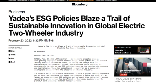ESG是英文Environmental(環(huán)境)、Social(社會(huì))和Governance(公司治理)的縮寫,是一種關(guān)注企業(yè)環(huán)境、社會(huì)、治理績效而非財(cái)務(wù)績效的投資理念和企業(yè)評(píng)價(jià)標(biāo)準(zhǔn)。近年來,我國及全球多個(gè)國家提出節(jié)能減排目標(biāo),綠色、低碳發(fā)展已經(jīng)成為全球共識(shí),與之高度關(guān)聯(lián)的ESG理念也在全球投資領(lǐng)域加速“出圈”,成為衡量上市公司價(jià)值和發(fā)展前景的新標(biāo)尺。而此次報(bào)道雅迪獲獎(jiǎng)的彭博社,也曾于2019年推出一系列ESG指數(shù)產(chǎn)品,成為全球范圍內(nèi)發(fā)掘并傳遞ESG投資價(jià)值的領(lǐng)銜機(jī)構(gòu)之一。