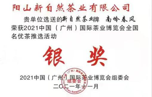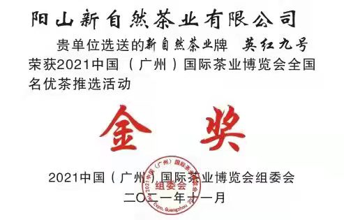就在2021年中國(廣州)國際茶業(yè)博覽會全國名優(yōu)茶推選活動中新自然茶業(yè)牌“英紅一號,”榮獲金獎,“南嶺春風(fēng)”榮獲銀獎。