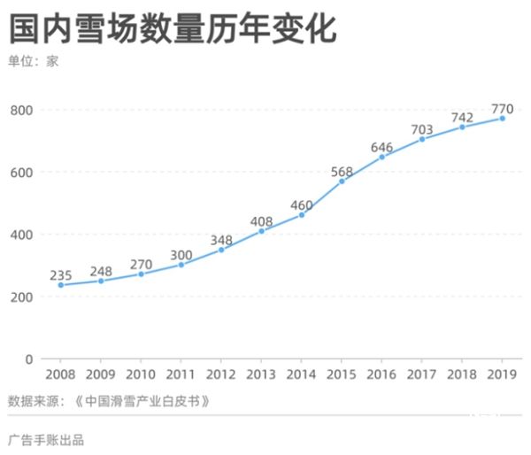 在中國(guó)成功申辦冬奧會(huì)后,冰雪運(yùn)動(dòng)基礎(chǔ)設(shè)施的建設(shè)開(kāi)始步入快車道,這也讓整個(gè)冰雪運(yùn)動(dòng)出現(xiàn)了明顯的產(chǎn)業(yè)化特征——2008年,彼時(shí)的國(guó)內(nèi)滑雪場(chǎng)數(shù)量?jī)H有235個(gè),而到了2019年這個(gè)數(shù)字已經(jīng)增長(zhǎng)至770家;帶動(dòng)的滑雪人次從500萬(wàn)次提升至1970萬(wàn)次,人均GDP也從6000元增長(zhǎng)至65000元。