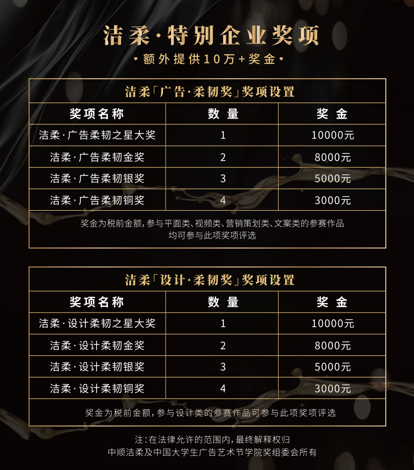本次征集活動(dòng),還額外設(shè)置了潔柔特別企業(yè)獎(jiǎng)項(xiàng)。所有參與創(chuàng)作潔柔命題的作品,除正常參與學(xué)院獎(jiǎng)常規(guī)獎(jiǎng)項(xiàng)評(píng)選外,還可以直接參與潔柔“廣告·柔韌獎(jiǎng)”和“設(shè)計(jì)·柔韌獎(jiǎng)”評(píng)選,并有機(jī)會(huì)獲得作品商業(yè)孵化落地的機(jī)會(huì)。