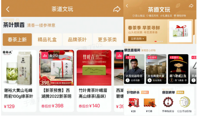 此外,為使消費者形成“早春茶”認知,打出茶品類的季節(jié)性招牌,抖音電商在茶道文玩頻道新增春茶資源位,聚焦春茶概念,為直播間與商品引流。