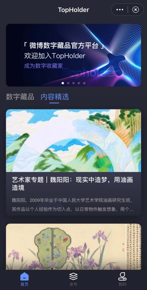 數(shù)字藏品功能上線后,微博用戶可以在TopHolder申請成為數(shù)字藏品創(chuàng)作人,將發(fā)布到微博的原創(chuàng)作品進行數(shù)字內容登記與溯源上鏈,一站式實現(xiàn)社交化數(shù)字藏品的生成,并展示在微博的個人主頁中。藏家用戶則可通過創(chuàng)作者的個人微博主頁查看其數(shù)字作品,并一鍵收藏心儀之作。