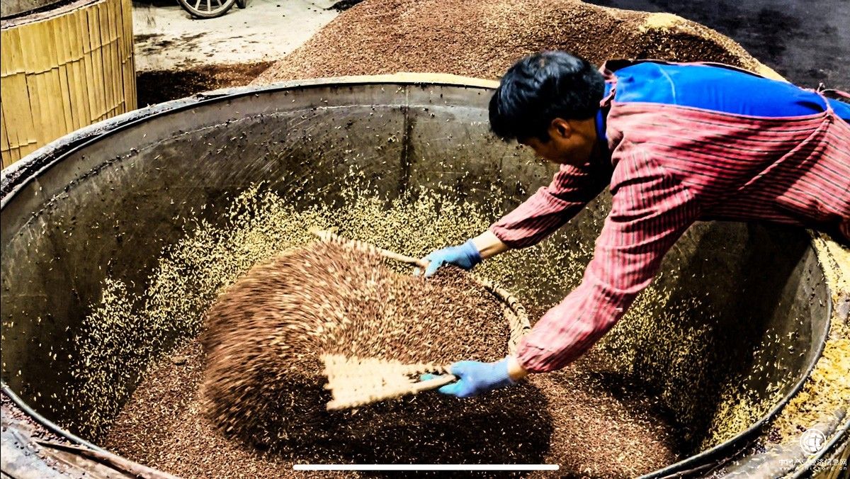 晾堂上,糟醅正散發(fā)著蒸汽,釀酒師開始將其攤晾制細。為了防止糟醅粘連結成塊,糟醅攤勻后要及時拉細掃松散,翻鏟成行,保證攤晾后的糟醅不成團。取酒后的糟醅,又經過人工攤晾,在充分降溫的同時,“網(wǎng)羅”空氣中有益的微生物,以便后續(xù)深入發(fā)酵。