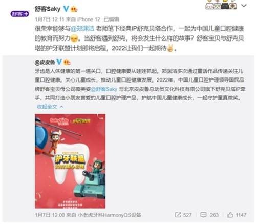今年年初,北京皮皮魯總動(dòng)員文化科技有限公司官方微博宣布,舒客寶貝母公司薇美姿與北京皮皮魯總動(dòng)員文化旗下舒克貝塔IP已成功牽手,計(jì)劃于2022共同打造小朋友喜愛的兒童口腔護(hù)理產(chǎn)品,護(hù)航中國兒童健康成長。隨后,“童話大王”鄭淵潔本人也轉(zhuǎn)發(fā)了相關(guān)微博。本次舒客寶貝品牌在兒童口腔健康護(hù)理上與鄭淵潔結(jié)緣,牽手合作“舒克貝塔IP”備受各方期待。