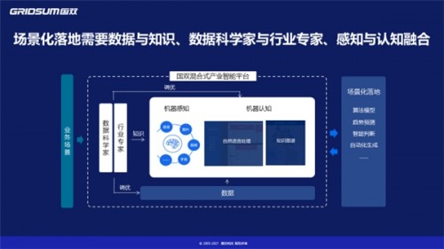 “混合式產(chǎn)業(yè)智能 ”是國(guó)雙賦能企業(yè)和政府組織數(shù)字化轉(zhuǎn)型、智能化升級(jí)的根本方法論。它注重行業(yè)經(jīng)驗(yàn),強(qiáng)調(diào)行業(yè)視角,包含了獨(dú)創(chuàng)的四重融合,即:感知智能和認(rèn)知智能融合,數(shù)據(jù)和知識(shí)融合,行業(yè)專(zhuān)家和數(shù)據(jù)科學(xué)家融合以及人與機(jī)器融合。這一方法論為場(chǎng)景化落地的路徑提供了一個(gè)科學(xué)的、行之有效的新范式。利用數(shù)據(jù)和知識(shí)的雙輪驅(qū)動(dòng),能夠把行業(yè)專(zhuān)家的經(jīng)驗(yàn)和知識(shí)代碼化,讓計(jì)算機(jī)替代人解決復(fù)雜問(wèn)題。