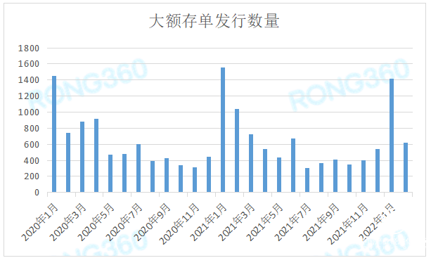 另外,根據(jù)融360|簡(jiǎn)普科技(NYSE:JT)數(shù)字科技研究院監(jiān)測(cè)的數(shù)據(jù)來看,2022年2月銀行大額存單發(fā)行數(shù)量為623只,環(huán)比下降56.03%,同比下降40.04%,1 月份是全年大額存單發(fā)行高峰期,此后會(huì)逐漸下降。