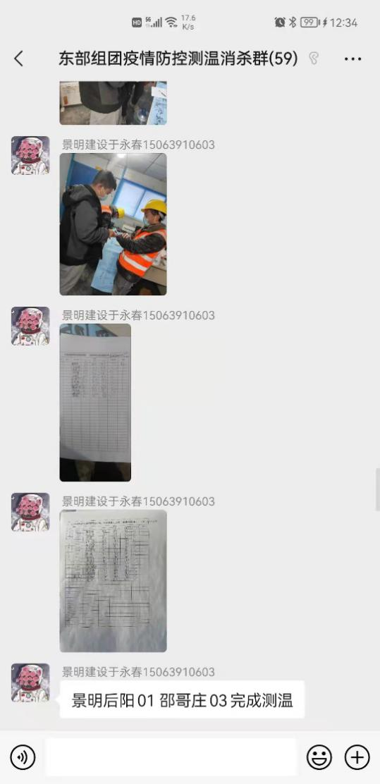 3、定時監(jiān)測查驗體溫,對項目人員及勞務(wù)工人每日進(jìn)行三次測溫,由專人監(jiān)督將測溫記錄、測溫照片上傳至項目測溫消殺群,確保應(yīng)檢盡檢,不漏一人。