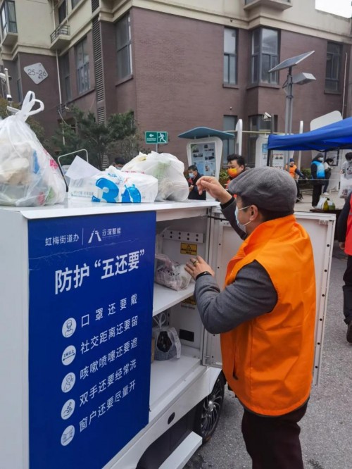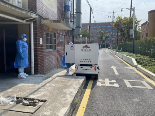 本輪疫情發(fā)生以后,行深智能得知閔行區(qū)江川路街道的物資運(yùn)輸困難后,迅速響應(yīng),派出防疫無(wú)人送餐車,投入到疫情防控物資無(wú)人配送工作中。