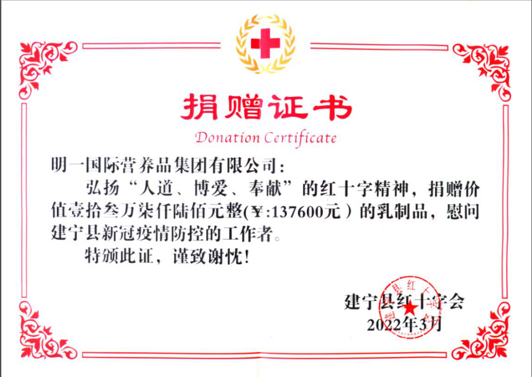 3月25日,明一國際再次向建寧縣紅十字會捐贈價值13.76萬元的物資,為堅守崗位的醫(yī)療部門、交通卡點、社區(qū)志愿者等一線抗疫人員提供營養(yǎng)支持。自2020年新冠疫情爆發(fā)以來,明一國際已累計捐贈700余萬元,彰顯企業(yè)社會擔(dān)當。