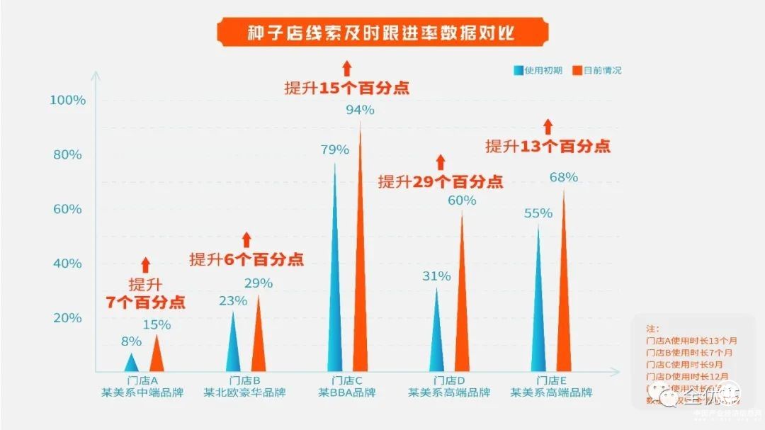 在車百靈之鈑噴管家試運營階段,我們合作了多家種子店進行長時間耕耘,從反饋數(shù)據(jù)看,使用了車百靈之鈑噴管家后,五家4S店的線索及時跟進率(5分鐘內(nèi)跟進線索)都有提升,使用效果最好的某美系高端品牌4S店門店D提升了29個百分點。