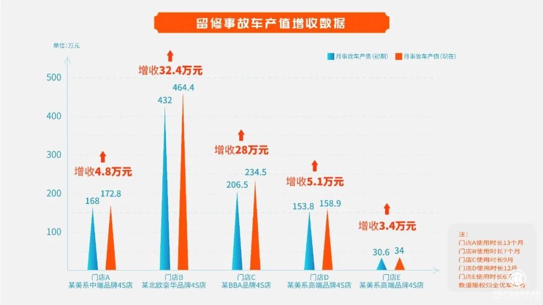線索及時跟進給店內(nèi)帶來最直接的價值便是最終留修率的提升,從種子店的使用效果看,效果最好的門店E最終留修率提升了9個百分點。按照種子店線索的平均產(chǎn)值計算,在使用了車百靈之鈑噴管家后,五家門店的留修收益提升了3.4萬元到32.4萬元不等。