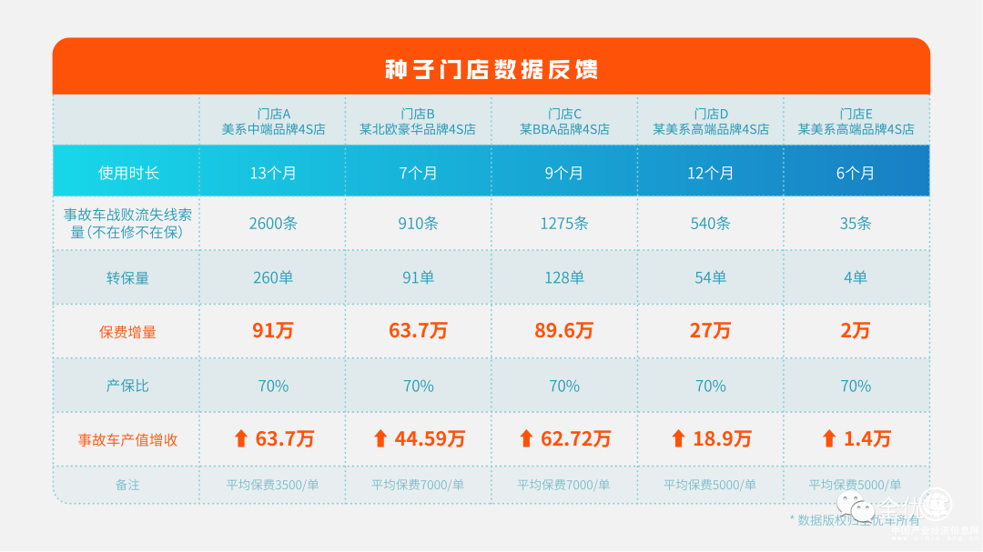 從種子店反饋情況看,店內(nèi)流失線索的轉(zhuǎn)保率約10%。根據(jù)門店保單均價不同,五家門店通過車百靈之鈑噴管家與車百靈之保險管家的融合獲得的保費增收額不等,以70%產(chǎn)保比換算,事故車產(chǎn)值增收從1.4萬元到63.7萬元不等(具體事故車轉(zhuǎn)保帶來的增收額如下)。