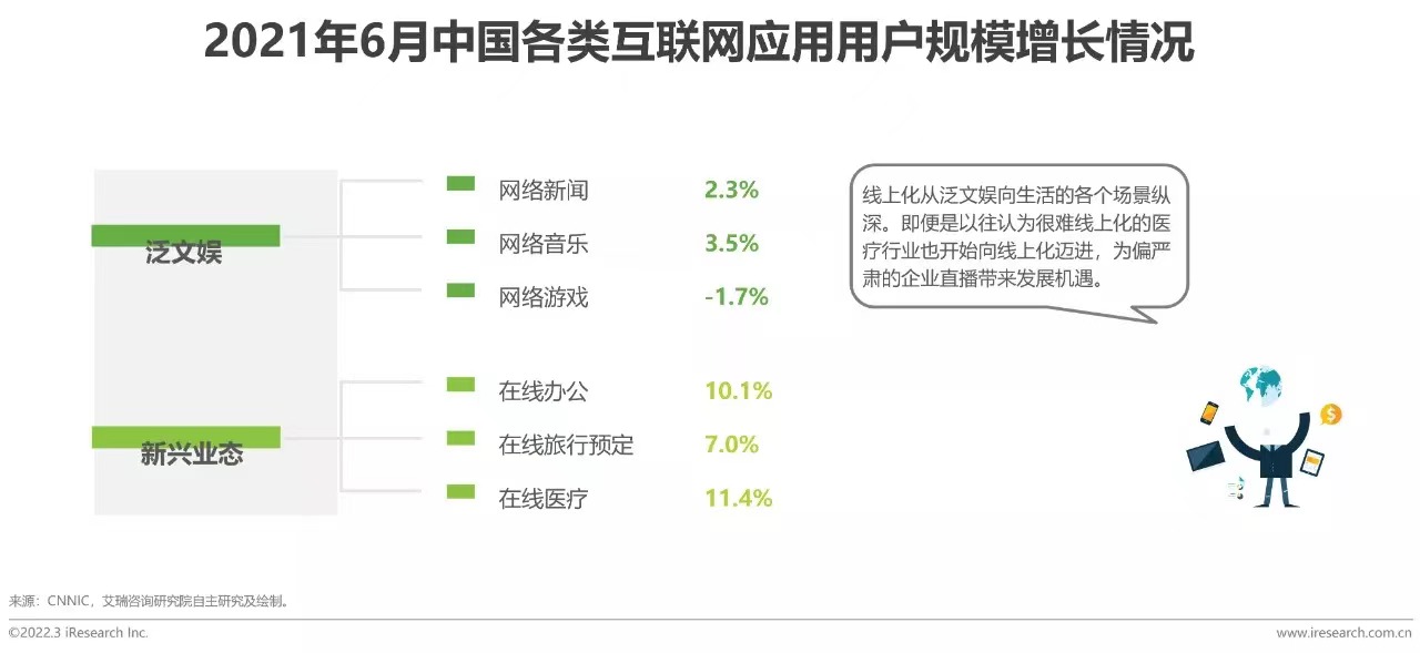 根據(jù)中國互聯(lián)網(wǎng)信息中心(CNNIC)的統(tǒng)計數(shù)據(jù)來看,受到疫情的助推,2020年以來網(wǎng)絡(luò)直播的用戶使用率明顯上升,近幾年網(wǎng)絡(luò)直播的用戶規(guī)模始終保持上升趨勢。同時,用戶對在線醫(yī)療、在線辦公等新業(yè)態(tài)的接受度不斷攀升,日常生活和工作線上化的趨勢不斷加深,網(wǎng)絡(luò)直播能力也逐漸發(fā)展為企業(yè)在數(shù)字化時代的新基建能力。進(jìn)而,用戶線上化需求提升帶來的機(jī)會,也帶動了企業(yè)直播行業(yè)的發(fā)展。