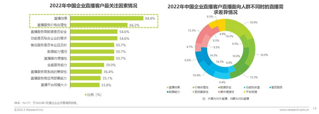直播效果和價格是客戶最關(guān)注因素,對內(nèi)直播最關(guān)注數(shù)據(jù)安全、對外更關(guān)注效果直播的效果(指安全性、穩(wěn)定性、流暢度)和直播服務(wù)價格的合理性,是用戶在選擇直播平臺時最看重的兩個因素。面向不同類型客戶進(jìn)行直播的企業(yè),對于需求的偏好存在一定差異性。企業(yè)客戶主要面向外部客戶/用戶進(jìn)行直播的情況下,直播效果、價格合理性、功能是否貼合企業(yè)的需求和系統(tǒng)操作便捷性是對外直播的企業(yè)客戶更為關(guān)注的幾個因素;然而,當(dāng)企業(yè)客戶僅對內(nèi)部員工進(jìn)行直播時,他們會更關(guān)注直播服務(wù)商保障數(shù)據(jù)安全的能力、直播服務(wù)商提供的售后服務(wù)是否足夠?qū)I(yè)及時、直播系統(tǒng)的兼容性和直播服務(wù)商的規(guī)模大小這類因素。由于直播面向?qū)ο蟮牟煌沟脙烧叱尸F(xiàn)出了較大的偏好差異性。