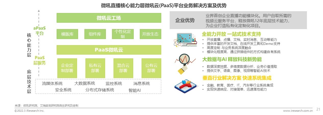 2022年越來越多的服務(wù)廠商從直播技術(shù)公司轉(zhuǎn)型為直播運(yùn)營公司,技術(shù)與服務(wù)的雙輪推動助力企業(yè)直播公司轉(zhuǎn)型。技術(shù)層方面,隨著中國云計算市場的不斷發(fā)展,公有云與私有云基于數(shù)據(jù)安全需求,推動生成混合云幫助企業(yè)穩(wěn)定底層技術(shù);在直播系統(tǒng)搭建方面,從SaaS標(biāo)準(zhǔn)化到PaaS、aPaaS個性化,底層技術(shù)閉環(huán)化發(fā)展全方面的滿足企業(yè)對直播系統(tǒng)搭建需求。服務(wù)層方面,直播服務(wù)商將從不同行業(yè)特殊性及行業(yè)痛點出發(fā),有針對性的提供更加精細(xì)化、專業(yè)化的服務(wù),并且針對不同企業(yè)提供一站式的個性化解決方案。“技術(shù)+服務(wù)”助力企業(yè)直播服務(wù)廠商朝著更加專業(yè)化、成熟化方向發(fā)展。