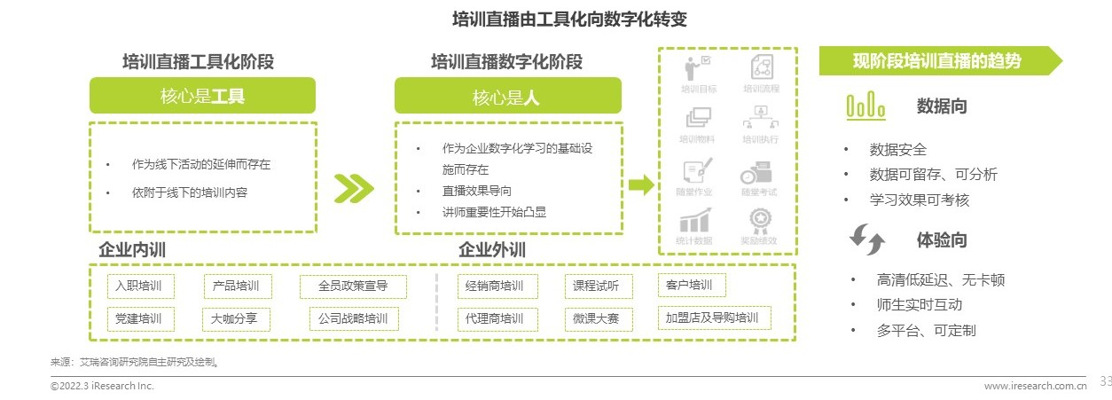 隨著直播行業(yè)的發(fā)展,企業(yè)培訓(xùn)場景下的價值不斷拓展,從過去僅把培訓(xùn)直播作為擴(kuò)展線下直播的渠道,到如今越來越多的行業(yè)開始使用直播進(jìn)行培訓(xùn)并有效利用直播這種手段達(dá)到降本增效的培訓(xùn)結(jié)果。培訓(xùn)直播的角色屬性同時也發(fā)生了轉(zhuǎn)換,從工具化階段到數(shù)字化階段升級。企業(yè)培訓(xùn)直播的運(yùn)營方式再豐富,培訓(xùn)互動、培訓(xùn)考核等功能不斷完善,培訓(xùn)直播越來越結(jié)果導(dǎo)向,培訓(xùn)數(shù)據(jù)的可留存和易分析,有效幫助企業(yè)提升培訓(xùn)直播的效果;同時優(yōu)秀講師對直播效果的調(diào)動作用越來越顯著,培訓(xùn)直播的效果由依賴工具功能轉(zhuǎn)向依賴人如何使用直播工具。