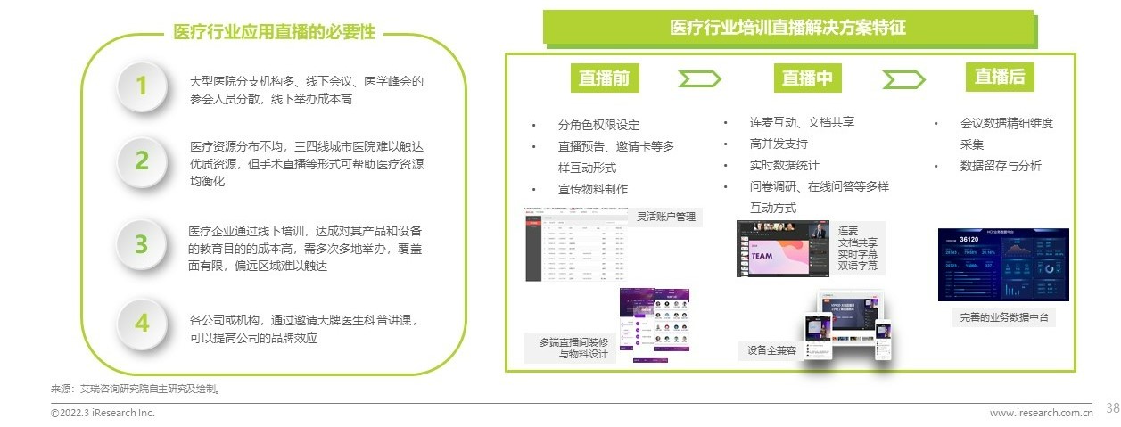 由于醫(yī)療資源發(fā)展的地域性不均衡,大型連鎖醫(yī)療機(jī)構(gòu)的跨地區(qū)運(yùn)行又較為普遍,同時,直播這種形式又可以節(jié)省成本、提高滲透率。因此培訓(xùn)直播在醫(yī)療行業(yè)中也有了較為廣泛的應(yīng)用。企業(yè)直播服務(wù)商根據(jù)醫(yī)療行業(yè)參會人員身份復(fù)雜、對會議信息安全審核要求高等特性,開發(fā)出了分角色權(quán)限設(shè)定、高并發(fā)支持、數(shù)據(jù)采集等契合醫(yī)療行業(yè)需求的直播解決方案,助力醫(yī)療行業(yè)實現(xiàn)跨地域交流,為醫(yī)療資源的均衡化做出一定貢獻(xiàn)。