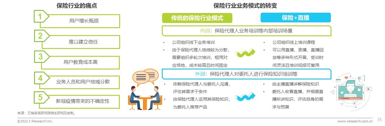 保險行業(yè)存在的痛點主要表現(xiàn)在:整體行業(yè)獲客增長困難。因人口紅利消失、經(jīng)濟(jì)增速放緩使保險行業(yè)用戶增長難度提升。其次,保險行業(yè)用戶教育成本居高不下。保險行業(yè)作為一個知識門檻較高的行業(yè),用戶在選購保險時需要研讀冗長的保險條款,根據(jù)自身的條件與需求進(jìn)行判斷,才能選擇到更適合的產(chǎn)品。第三,行業(yè)與用戶建立信任感難。因國人對于保險行業(yè)的認(rèn)知不夠全面,對于保險帶有天然的抵觸情緒,因此行業(yè)嚴(yán)重依賴保險代理人與用戶進(jìn)行多輪次的一對一溝通,為其推薦符合其需求與預(yù)算的產(chǎn)品,才能最終促進(jìn)保險成單。第四,“黑天鵝”為行業(yè)帶來不確定性。疫情的到來使得保險行業(yè)難以開展線下推廣活動,進(jìn)一步限制了發(fā)展新客戶。最后,保險行業(yè)的人員和用戶在地域分布上較為分散的,不利于行業(yè)模式化發(fā)展。而“保險+直播”新形式的出現(xiàn),解決了行業(yè)的痛點問題,一方面,在對內(nèi)培訓(xùn)方面,保險行業(yè)人員分散,使用直播培訓(xùn)可以幫助其降本增效;另一方面,在針對委托人進(jìn)行外訓(xùn)時直播更是能有效賦能業(yè)務(wù)。