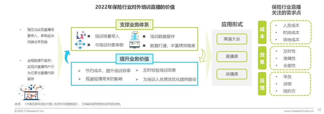 由復(fù)旦大學(xué)發(fā)展研究院發(fā)布的《中國互聯(lián)網(wǎng)保險代理人生存狀況調(diào)查報告》顯示,在疫情的推動下,2021年有94.2%的互聯(lián)網(wǎng)保險代理人都認(rèn)為直播對于保險業(yè)績提升有促進(jìn)作用。保險行業(yè)高度依賴與用戶的互動,因此具有較強(qiáng)私域?qū)傩?,在直播工具的賦能之下,有效地帶動了行業(yè)用戶增長。保險行業(yè)下的企培直播既有面向渠道商的渠道大會,也有面向C端客戶的保險知識科普課程。此外,企培場景直播即可以實現(xiàn)對保險行業(yè)的業(yè)務(wù)體系的支撐;進(jìn)而又能促進(jìn)保險行業(yè)營銷場景直播的轉(zhuǎn)化,提升業(yè)務(wù)價值,兩者協(xié)同發(fā)展共同驅(qū)動保險業(yè)務(wù)增長。