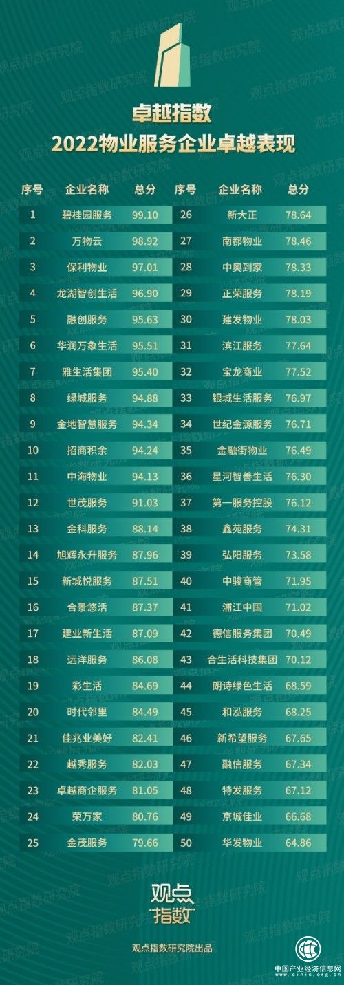 4月12日,“2022觀點物業(yè)大會”在廣州舉行。會上,觀點指數(shù)研究院發(fā)布了“2022物業(yè)服務(wù)企業(yè)卓越表現(xiàn)”榜單,該榜單通過多方調(diào)研、模型搭建等,對物業(yè)服務(wù)企業(yè)全年運營及財務(wù)數(shù)據(jù)進(jìn)行評測,并綜合衡量其品牌、管理及創(chuàng)新能力,最終有50家企業(yè)入選榜單。碧桂園服務(wù)憑借優(yōu)異的運營管理能力、品牌力與創(chuàng)新表現(xiàn)獲得99.10的高分,蟬聯(lián)榜單第一。