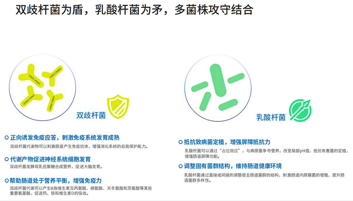 對于調(diào)節(jié)腸道微生態(tài)而言,最好的方式是適量補充雙歧桿菌和乳酸桿菌,其中雙歧桿菌能夠正向誘發(fā)免疫應(yīng)答,起到“盾”的作用,乳酸桿菌能夠產(chǎn)酸,調(diào)節(jié)局部pH值,起到“矛”的作用。多菌株攻守結(jié)合,形成更好的腸道屏障,抑制有害菌的生長。對于許主任提出的“攻守兼?zhèn)洹笨茖W理念,也正是上藥信誼H5精神益生菌的研發(fā)理念,“3矛2盾”,更全面的守護發(fā)育遲緩兒童的腸道健康。
