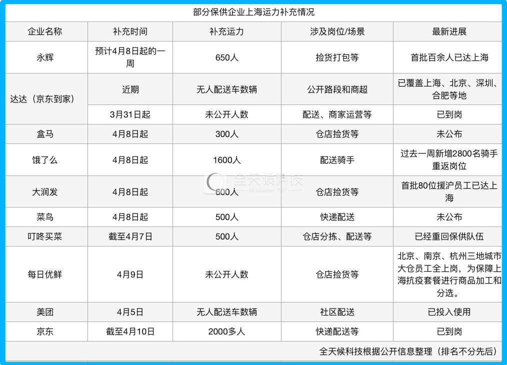 最新消息,餓了么、大潤發(fā)、盒馬、菜鳥等阿里系企業(yè)將新增抗疫保供人員3000人,其中,大潤發(fā)首批80位援滬員工已于4月9日下午抵達(dá)上海;叮咚買菜已召集近500名一線員工,重回保供隊伍;永輝預(yù)計未來一周將增調(diào)650人馳援上?!翱挂摺北9?。