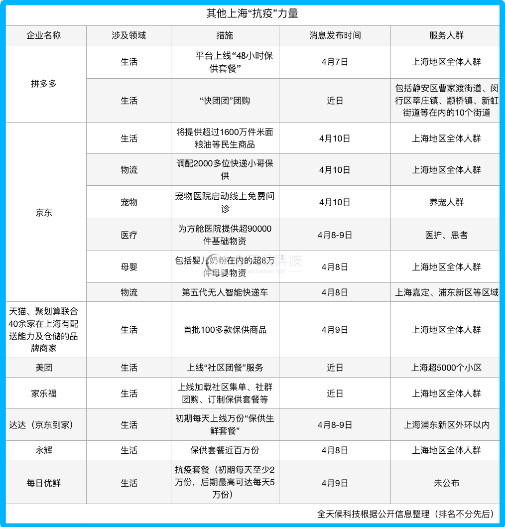 4月10日,官方通報,截至9日,上海已有出院患者和解除醫(yī)學(xué)觀察人員11000多人。上海楊浦首批商超、便利店、餐飲等身邊小店和藥店正在陸續(xù)恢復(fù)運營,京東、拼多多、天貓等電商渠道也在逐步打通、接受訂單,每日優(yōu)鮮、叮咚買菜等生鮮電商又開始回歸個人訂單業(yè)務(wù),線上線下保障居民生活的行業(yè)都已啟動。