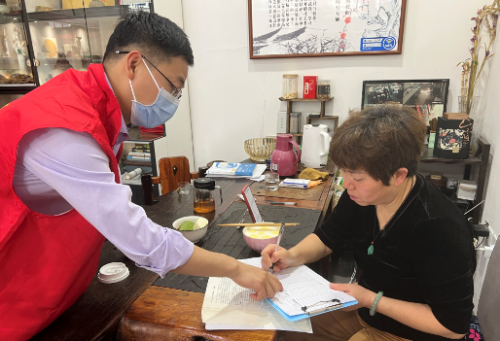 圖為:浦江縣煙草專賣局“香溢”青年志愿者協(xié)助社區(qū)入戶登記店鋪信息