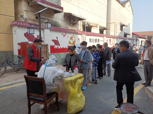 在負責(zé)小區(qū)管控的同時,黨員志愿者們還與醫(yī)護人員、社區(qū)工作者并肩作戰(zhàn),挨家挨戶通知居民準備進行核酸檢測,以親切的口吻引導(dǎo)群眾有序排隊,測量體溫,幫助老年人掃碼登記,確保小區(qū)核酸檢測有序開展。