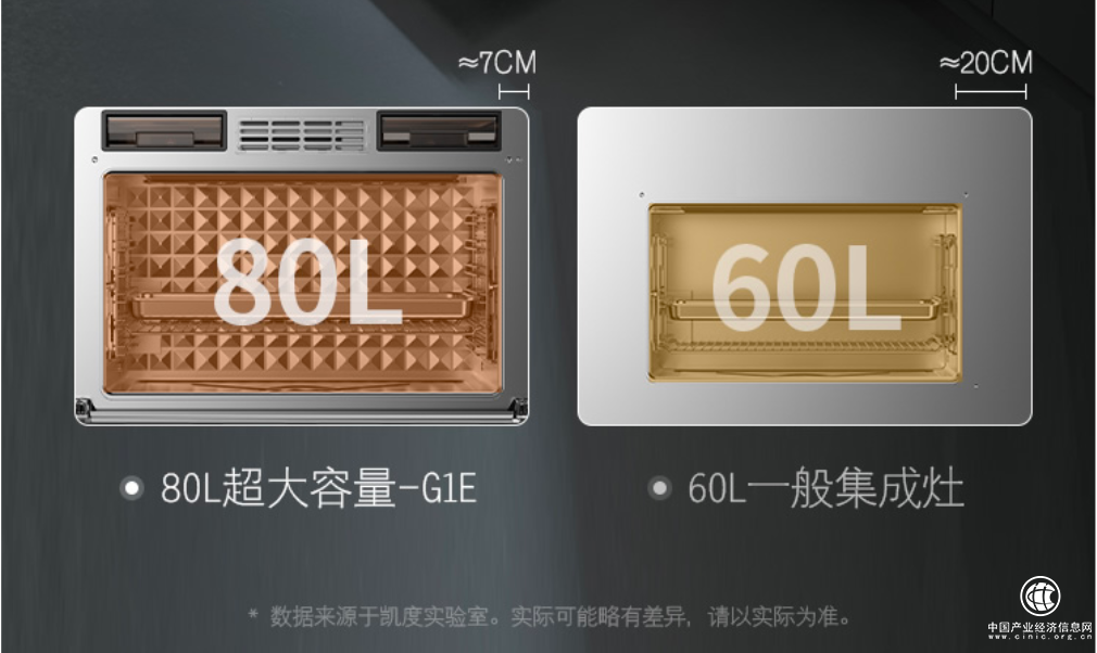 之所以有這樣的設(shè)計(jì),是基于凱度對(duì)市場(chǎng)上小容量蒸烤集成灶核心痛點(diǎn)的洞察:首先,集成灶蒸烤腔為“火柴盒”型的矩形設(shè)計(jì),這種設(shè)計(jì)如果容量太小,深度不夠的話,很難裝下帝王蟹、澳龍、烤羊腿等大塊食材;其次,一般集成灶的蒸烤腔邊框都在15cm以上,甚至是20cm,這既浪費(fèi)掉了大量空間,也高度影響了產(chǎn)品的美觀性,即使是走大容量路線的蒸烤集成灶容量通常也僅有60L;再者,這種腔體左右間距非常大,如果只是單熱風(fēng),很容易造成食材受熱不均勻,比如烤羊腿,這頭烤焦了,那頭可能還是夾生的。