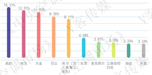 細分到品牌層面,美的以15.31%的市場份額領跑全球中央空調(diào)品牌,排在第一位,格力、大金、日立、海爾、東芝等品牌位居其后。從品牌差距來看,高居榜首的美的中央空調(diào)市場份額呈明顯領先優(yōu)勢。
