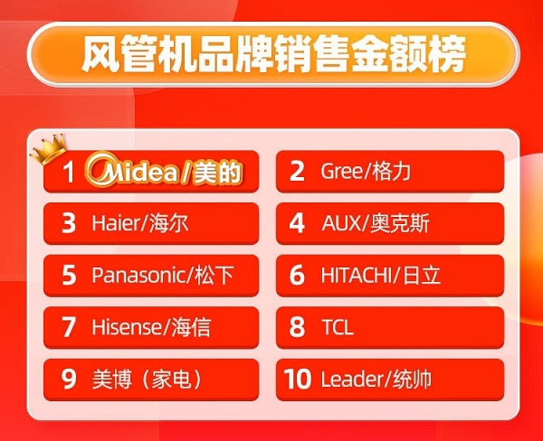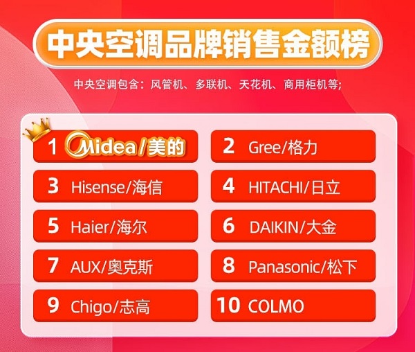 根據(jù)天貓消費電子集成家電行業(yè)排行榜4月榜單顯示,在“中央空調(diào)品牌”與“風管機品牌”銷售金額榜榜單上,美的中央空調(diào)摘得“雙冠”,成為了最受中國消費者青睞的中央空調(diào)品牌。