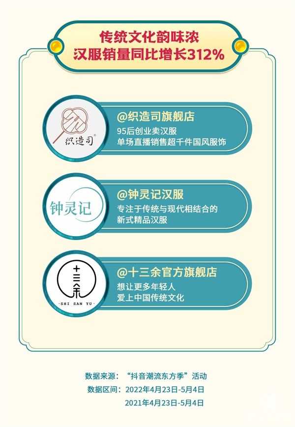 4月23日至5月4日,為期12天的“抖音潮流東方季”活動收官,該活動聚焦國貨、老字號、傳統(tǒng)手工藝品,滿足消費者在衣食住行各方面的購物需求?;顒悠陂g,該平臺國貨銷量穩(wěn)定走高,同比增長79%。其中,漢服深受用戶青睞,銷量同比增長312%。