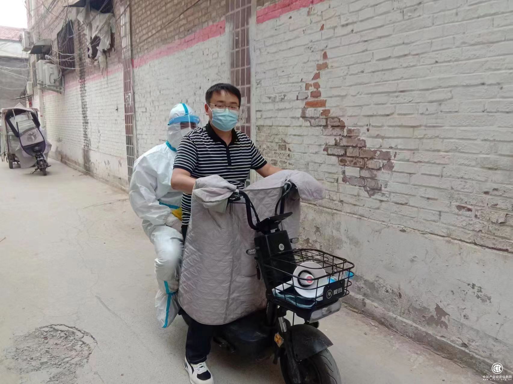 黨員趙振亞騎車帶著醫(yī)務(wù)工作人員在鹿邑縣紅星社區(qū)入戶開展核酸樣本采集