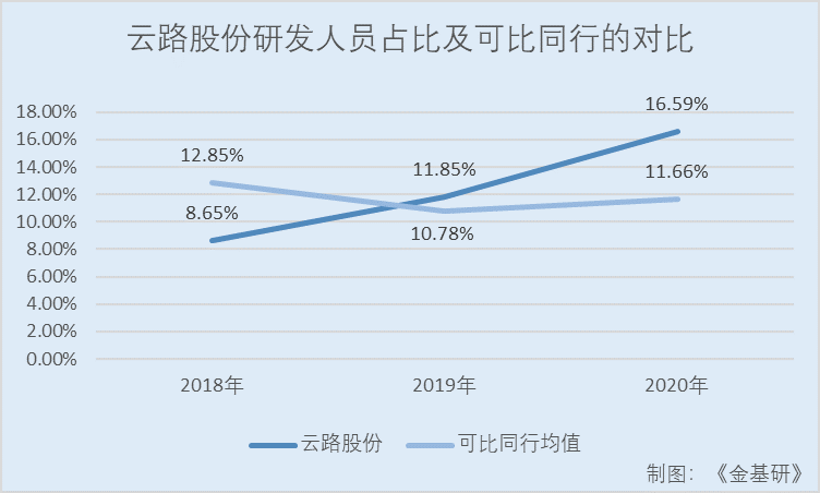 2018-2021年,云路股份研發(fā)人員占比分別為8.65%、11.85%、16.59%、20%;2018-2020年,同行業(yè)可比公司安泰科技、揚電科技、鉑科新材及橫店東磁研發(fā)人員占比的均值分別為12.85%、10.78%、11.66%。