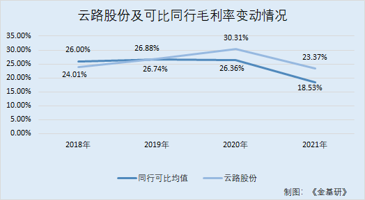 可見,2018-2021年,云路股份的綜合毛利率整體呈上升趨勢,且2019-2021年云路股份的綜合毛利率已超越同行均值。