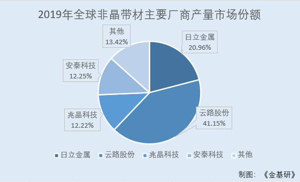 根據(jù)QY Research的統(tǒng)計數(shù)據(jù),2019年全球非晶帶材主要廠商有日立金屬、云路股份、兆晶科技、安泰科技、其他廠商,產(chǎn)量分別占市場的份額為20.96%、41.15%、12.22%、12.25%、13.42%。