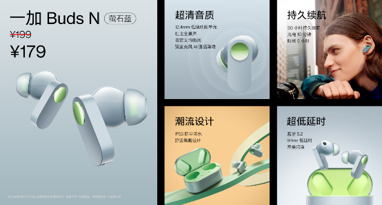 除一加 Ace競速版之外,一加還帶來了一加無線藍牙耳機 Buds N的全新配色——螢石藍。一加 Buds N擁有12.4mm超大低頻動圈單元,最高支持30小時的續(xù)航,單支僅4.8g,佩戴舒適聽感優(yōu)秀。新推出的螢石藍配色款采用了內外撞色的設計,更顯時尚精致。